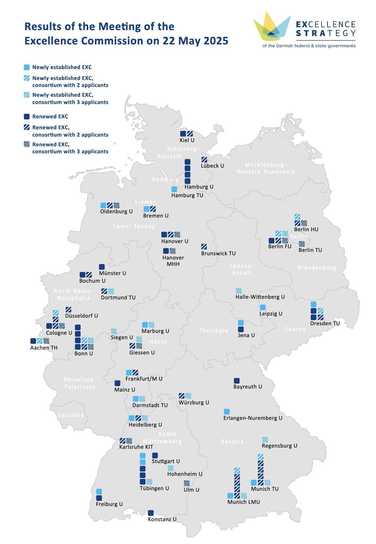 2025年5月22日にボンの DFG 本部で発表された第2期(2026–2032)では、98件の応募から70件のクラスター(新規25件、継続45件)が採択された。年間総額約5億3900万ユーロが投入され、43の単一大学クラスター、18の2大学共同クラスター、9つの3大学共同クラスターという構成となっている。人文社会科学系は第1期と同様の比率を維持していると推定される。