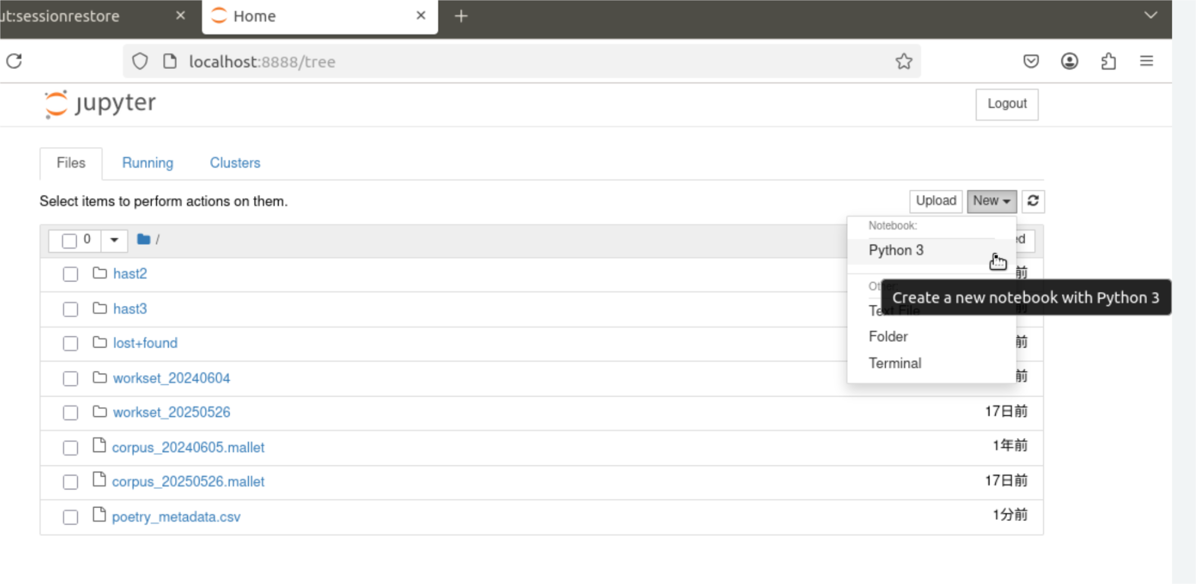 最初の画面で、図2のようにジュピターノートブックを新規作成する。