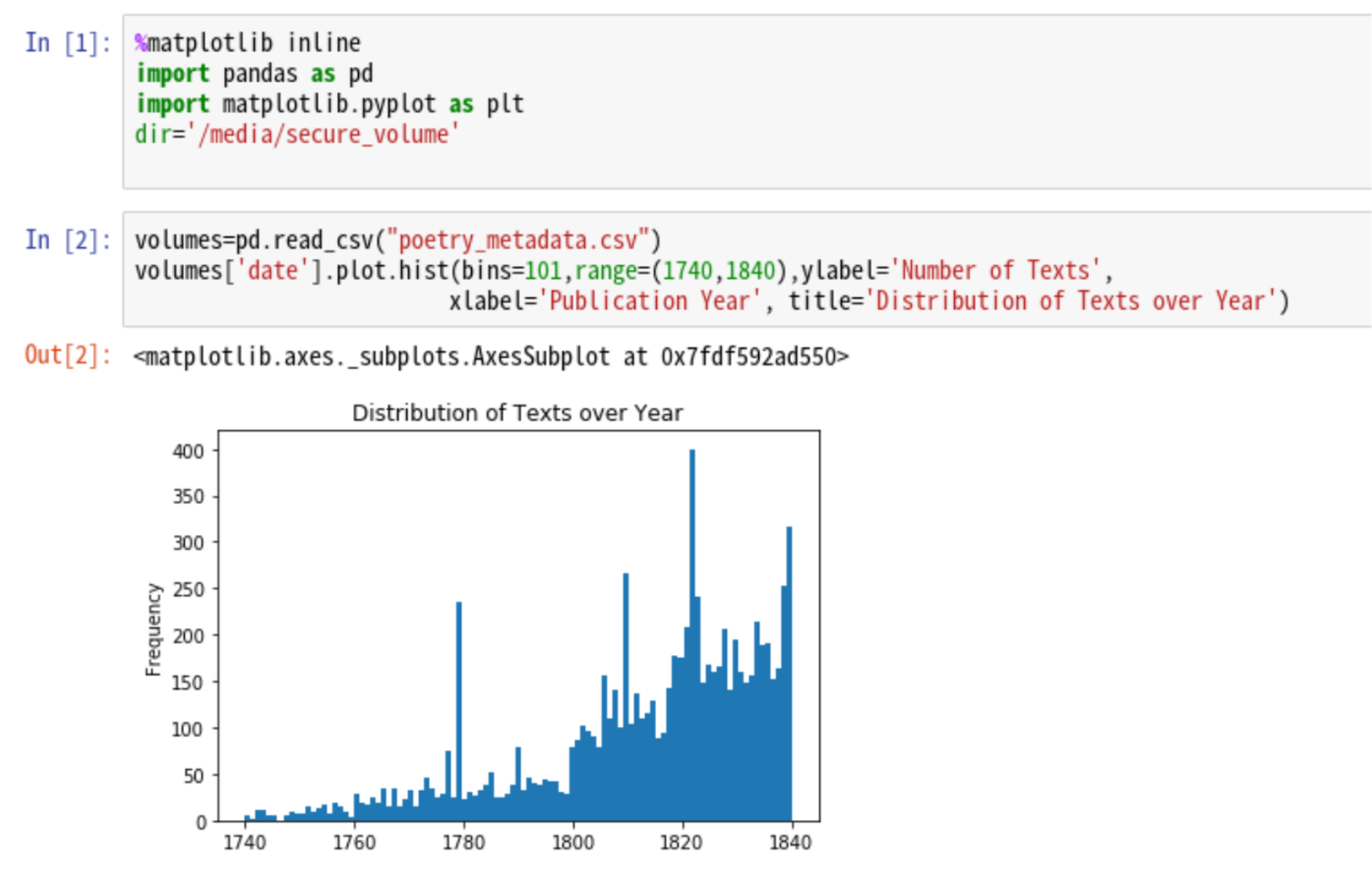 アナコンダはデータサイエンスや機械学習のためのプラットフォームであり、Python によるプログラム作成などを行うことができる[5]。Pythonを使うには、アナコンダの中のジュピターノートブックというソフトウェアを使うことが多いだろう。例えば、1740年から1840年に出版されたハティトラストに所収の書籍データの数量をグラフにしたいとする。ここで一つ注意する点は、インターネットが使えるのはメンテナンスモードのみであり、またハティトラストの書籍データを扱えるのはセキュアモードのみであるということである。生成AIでプログラムを作成させる場合など、インターネットを使う場合は都度メンテナンスモードに戻る必要がある。