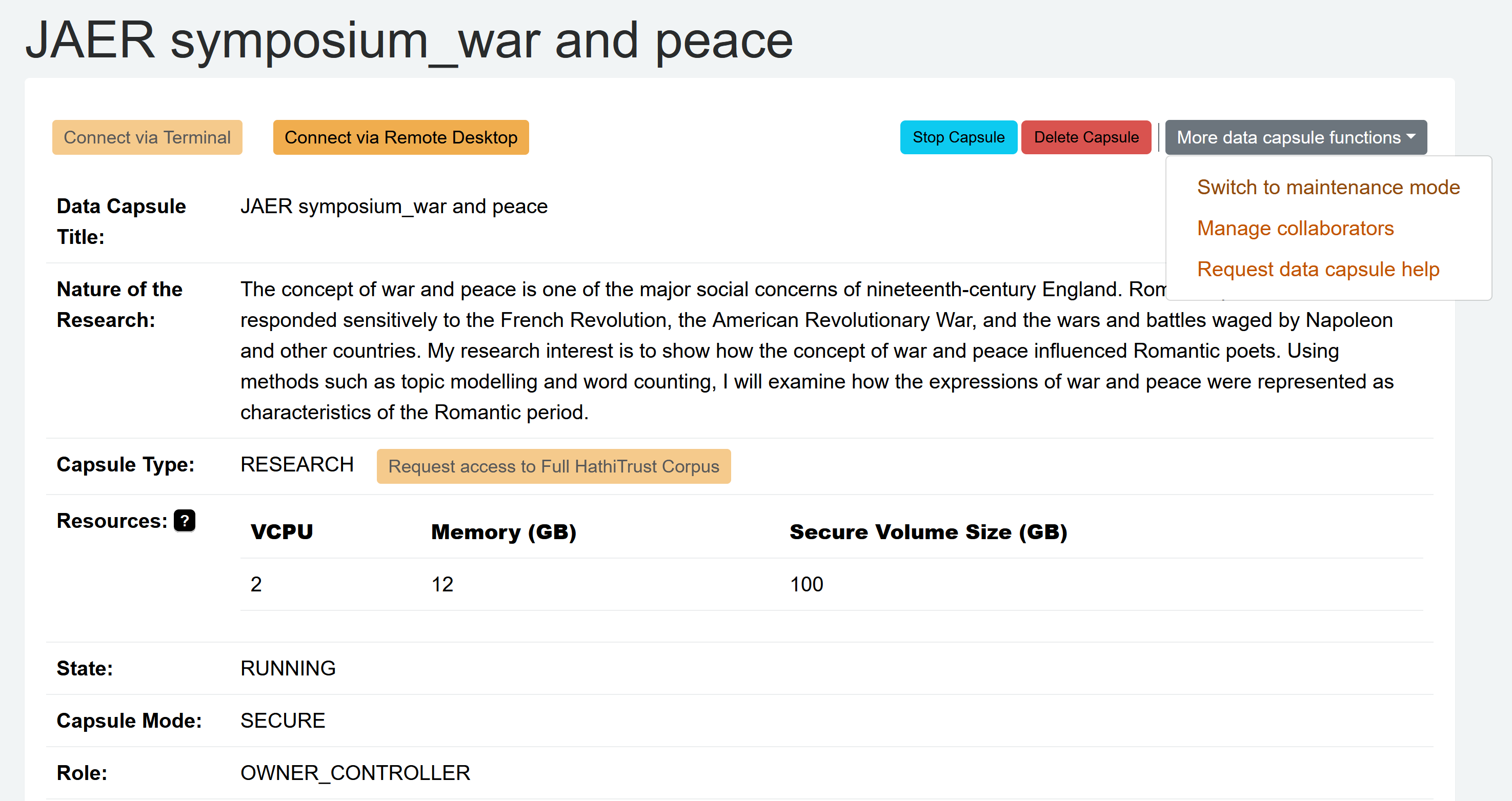 書籍データの量にもよるが、数時間から一日以上かかることもある。ブラウザを修了させ PC をシャットダウンして待っていてよい。HTRC のウェブサイトからデータカプセルを開くと、リモートの接続先のデータカプセルは処理を実行し続けていることがわかる。事前準備が終了したら、以下を参考にコマンドを実行して分析実行を行う。オプションの詳細はウェブサイトおよびマレットのヘルプファイルにある[8]。同様に長い時間がかかる点に注意である。