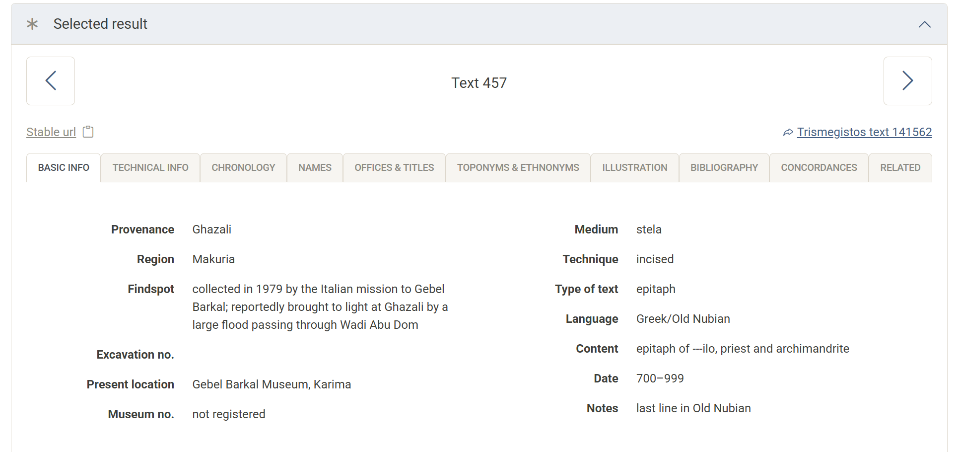 DBMNT は2011年に公開された。当初は Ochała 氏の博士論文『Chronological Systems of Christian Nubia』[3]の付随資料として、年代情報を含む733件のテキストを収録していたが、20年以上にわたる継続的な拡張により、現在では4,518件のテキストレコードを擁する包括的データベースへと成長している。Ochała 氏はこのプロジェクトを「ヌビアの Trismegistos」と位置づけ、キリスト教ヌビアの文字史料に関する究極の知識源となることを目指している。