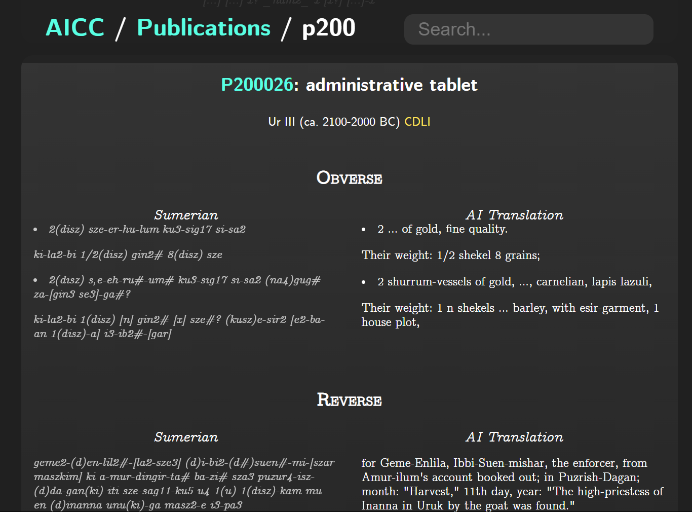 2023年に発表された Frank Ramos 氏による AI Cuneiform Corpus(AICC)[5]は、楔形文字研究に革命的な転換をもたらした。Google の T5トランスフォーマーモデルを楔形文字テキストに適用し、129,705件(シュメール語99,295件、アッカド語30,410件)の自動翻訳を実現したのである。このうち、従来未翻訳であったシュメール語98,492件、アッカド語21,678件が英語でアクセス可能となり、研究資料の大幅な拡充が達成された。