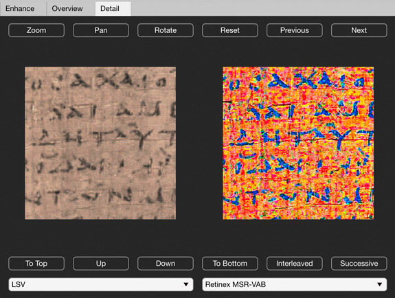 D-scribes の技術基盤は、READ(Research Environment for Ancient Documents)[4]プラットフォームを中心に構築された。PostgreSQL データベース、IIIF 準拠の Mirador ビューアによる画像アノテーション機能、GitLab を活用した協働ワークフロー管理システムを統合し、TEI P5 XML 標準でのデータ交換を実現した。特筆すべきは、Vlad Atanasiu 氏が開発した HIERAX ソフトウェア[5]である。この MATLAB ベースのアプリケーションは、Vividness、LSV、Adapthisteq、Retinex など複数の画像のハイライト・アルゴリズムを搭載し、劣化したパピルスの可読性を飛躍的に向上させた。