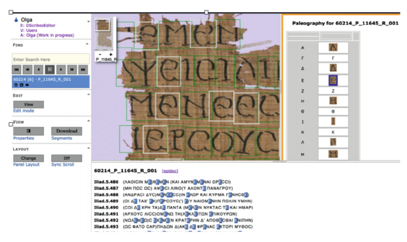 深層学習技術の応用において、プロジェクトは慎重かつ実践的なアプローチを採用した。当初は Transkribus プラットフォーム[8]での手書き文字認識(HTR)テストを実施したが、パピルスの複雑性により手動での文字レベルアノテーションを重視する方針を選択した。ICDAR 2023ではギリシャ文字手書き認識のコンペティションを主催団体の1つとして開催し[9]、194以上のギリシャ文字バリアントの認識に挑戦し、優勝チームは YOLOv8アンサンブル・モデルとトランスフォーマー・ベースの手法を組み合わせ、認識・検出の両方で、非常に高い精度を達成した。