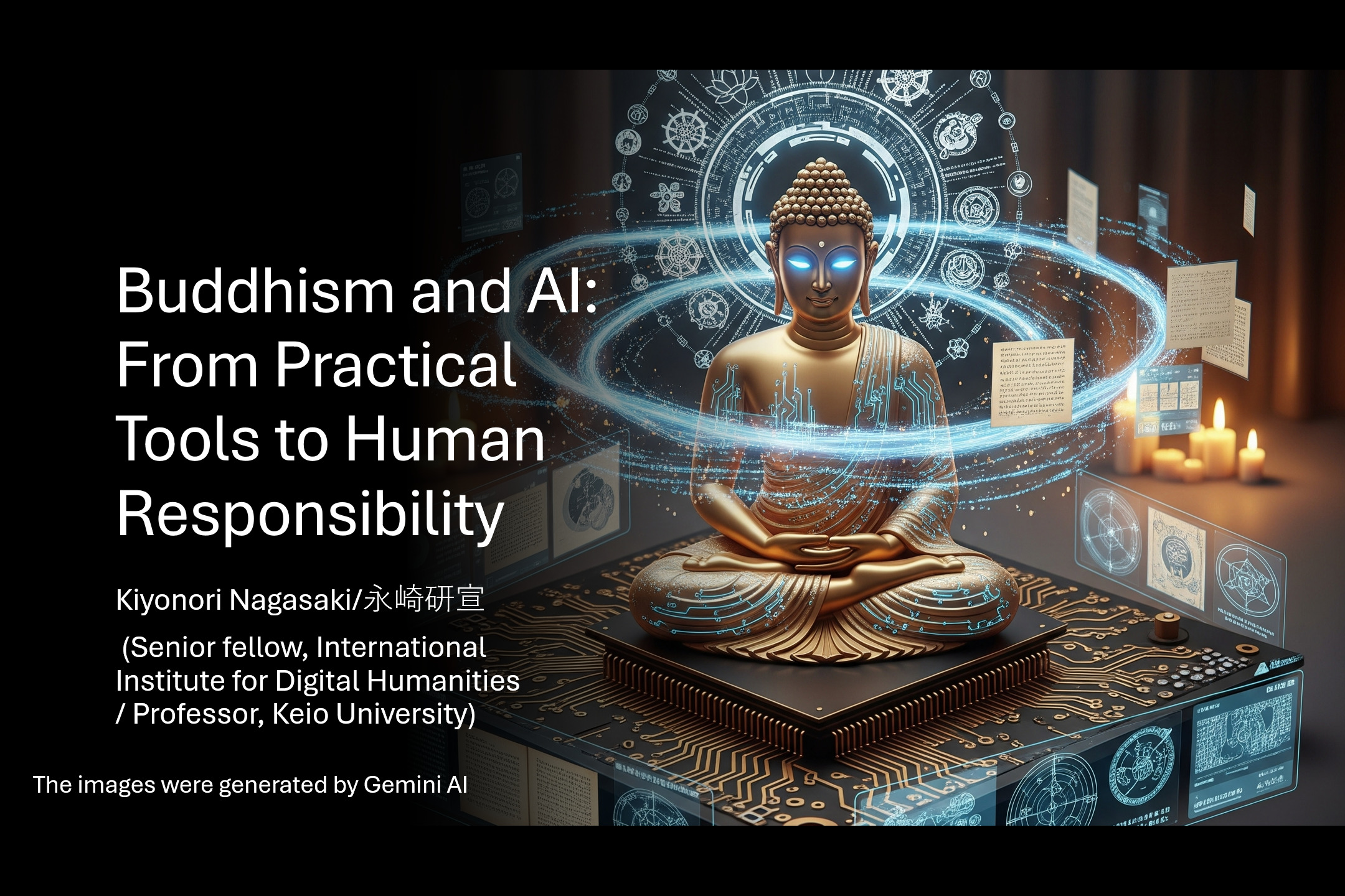 この数日滞在しているポーランドのクラクフでは、世界宗教史学会というところで仏教と AI について話をする機会をいただきましたので、試しに、発表原稿を Google Gemini に読み込ませてスライドに入れるイラストを作ってもらったところ、以下のようななんとも大仰なものができてきました。自分でこれを書くことを想像すると、デザインのセンスはもちろんですが、細部を調整することを考えてみても、とても自分では無理だと感じてしまいます。