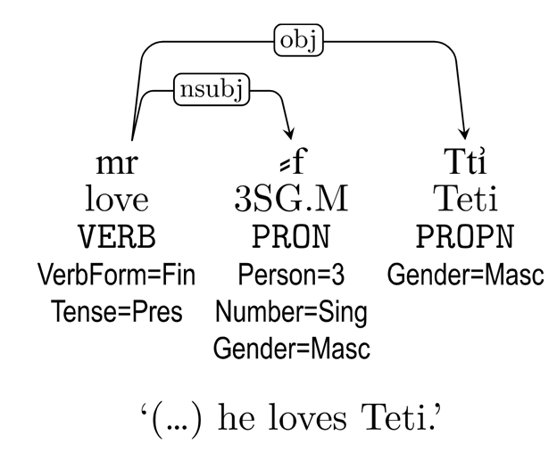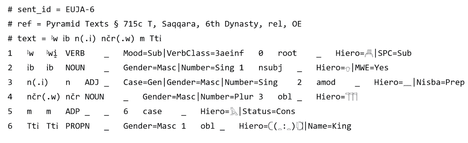 この UD の枠組みに、2024年、ついにコプト語以前のエジプト語の1つである古エジプト語が加わった。これですでに2016年から公開されているコプト語(エジプト語の最終段階)と、古エジプト語(エジプト語の初期段階)の数千年間の統語変化を定量的に解析可能にする大枠ができあがった。